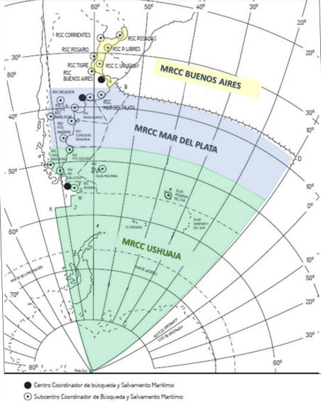 La República Argentina le corresponde la responsabilidad desde el polo sur, 10° longitud, en la Región de Responsabilidad SAR de la República Argentina (RASRR) establecida por la Organización Marítima Internacional